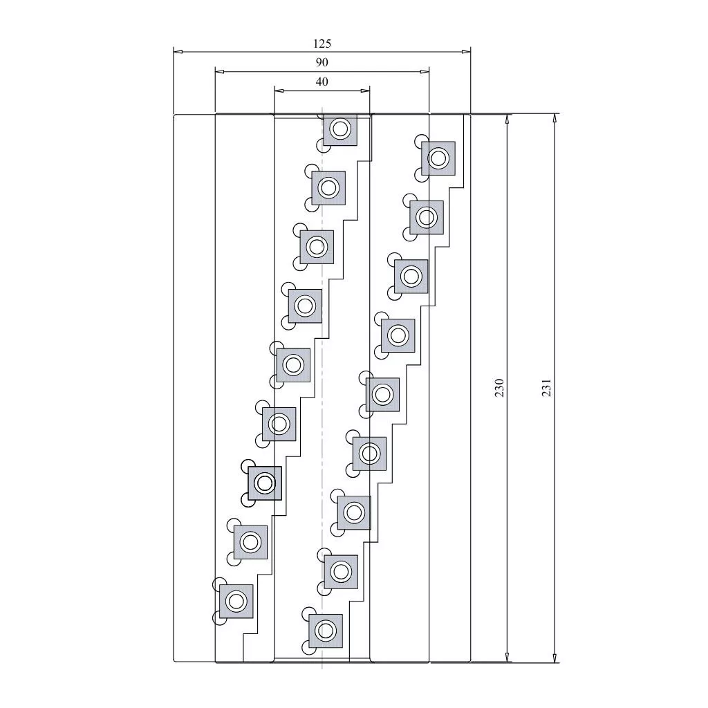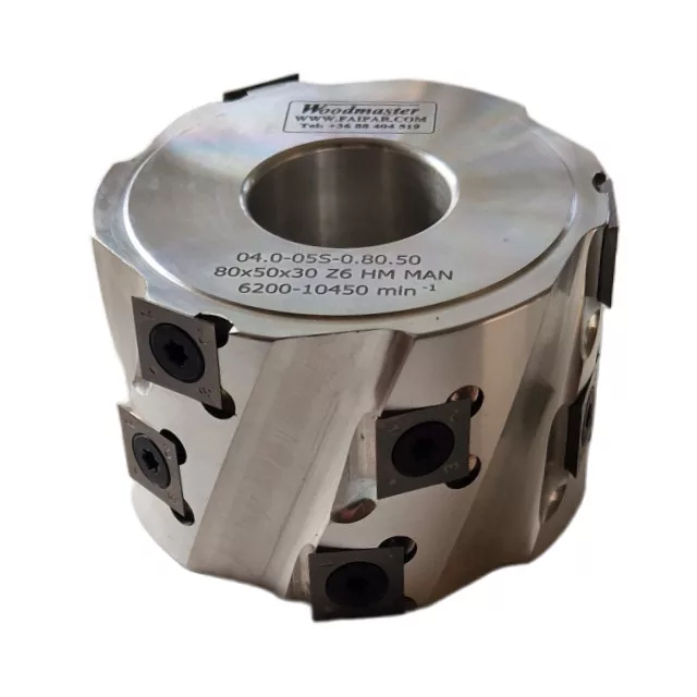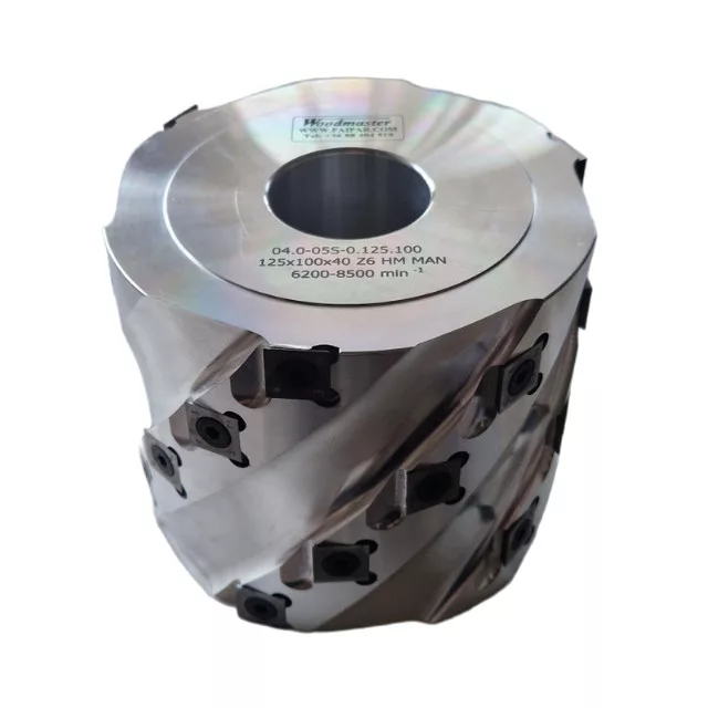 Hobľovacia hlava s priemerom 125 mm, hrúbkou 230 mm, 54 nožmi, SK, a vnútorný priemer 40 mm. Frézovacia hlava Woodmaster priemyselnej kvality na drevo s karbidovými (vidia) zubami Tigra Germany.