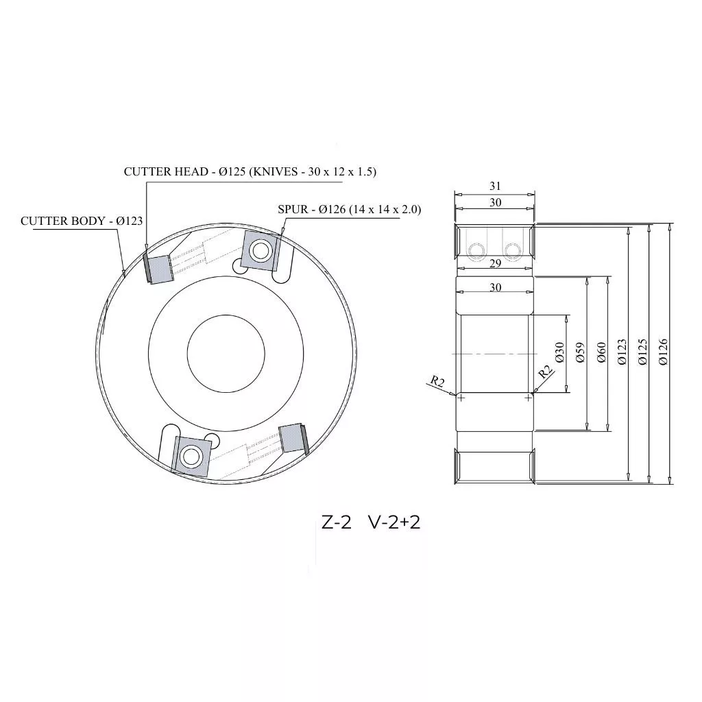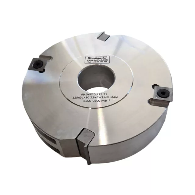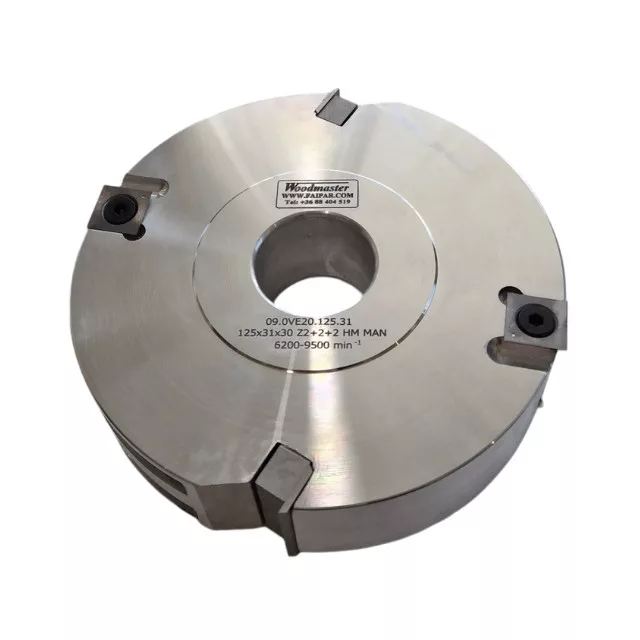 Falcovacia fréza s priemerom 125 mm, hrúbkou 31 mm, 2 nožmi, 4 predrezmi, SK, s výmennými britovými doštičkami a vnútorný priemer 30 mm. Frézovacia hlava Woodmaster priemyselnej kvality na drevo s karbidovými (vidia) zubami.
