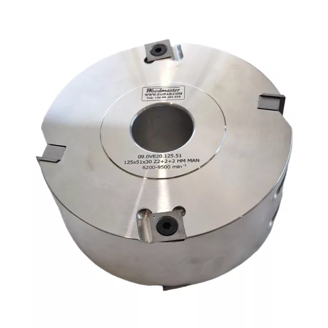 Falcovacia fréza s priemerom 125 mm, hrúbkou 51 mm, 2 nožmi, 4 predrezmi, SK, s výmennými britovými doštičkami a vnútorný priemer 30 mm. Frézovacia hlava Woodmaster priemyselnej kvality na drevo s karbidovými (vidia) zubami.