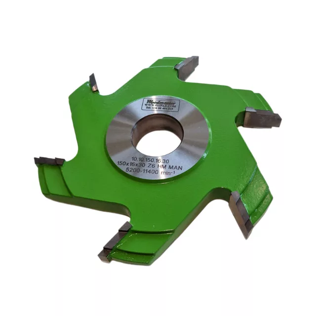 Fréza na celoobvodové kovanie s priemerom 150 mm, hrúbkou 16,3 mm, 6 nožmi, SK, so spájkovanými doštičkami a vnútorný priemer 40 mm. Frézovacia hlava Woodmaster priemyselnej kvality na drevo s karbidovými (vidia) zubami Tigra Germany.