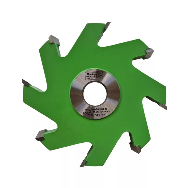 Drážkovacia fréza s priemerom 170 mm, hrúbkou 25 mm, 8 nožmi, SK, so spájkovanými doštičkami a vnútorný priemer 30 mm. Frézovacia hlava Woodmaster priemyselnej kvality na drevo s karbidovými (vidia) zubami Tigra Germany.